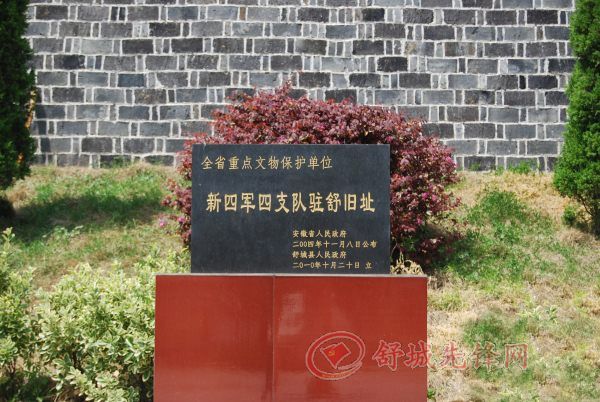 新四軍四支隊駐舒舊址紀念館座落于高峰鄉東港村原韋家大屋,距縣城65公里,系六安市9大紅色旅游項目重點工程之一。1938年6月高敬亭司令率新四軍四支隊進駐韋家大屋,在這里指揮四支隊英勇頑強地抗擊日寇,創造了可歌可泣的英雄業績,尤其是蔣家河戰斗,打響了新四軍對日作戰的第一槍,在抗日戰爭史上具有重要的意義。